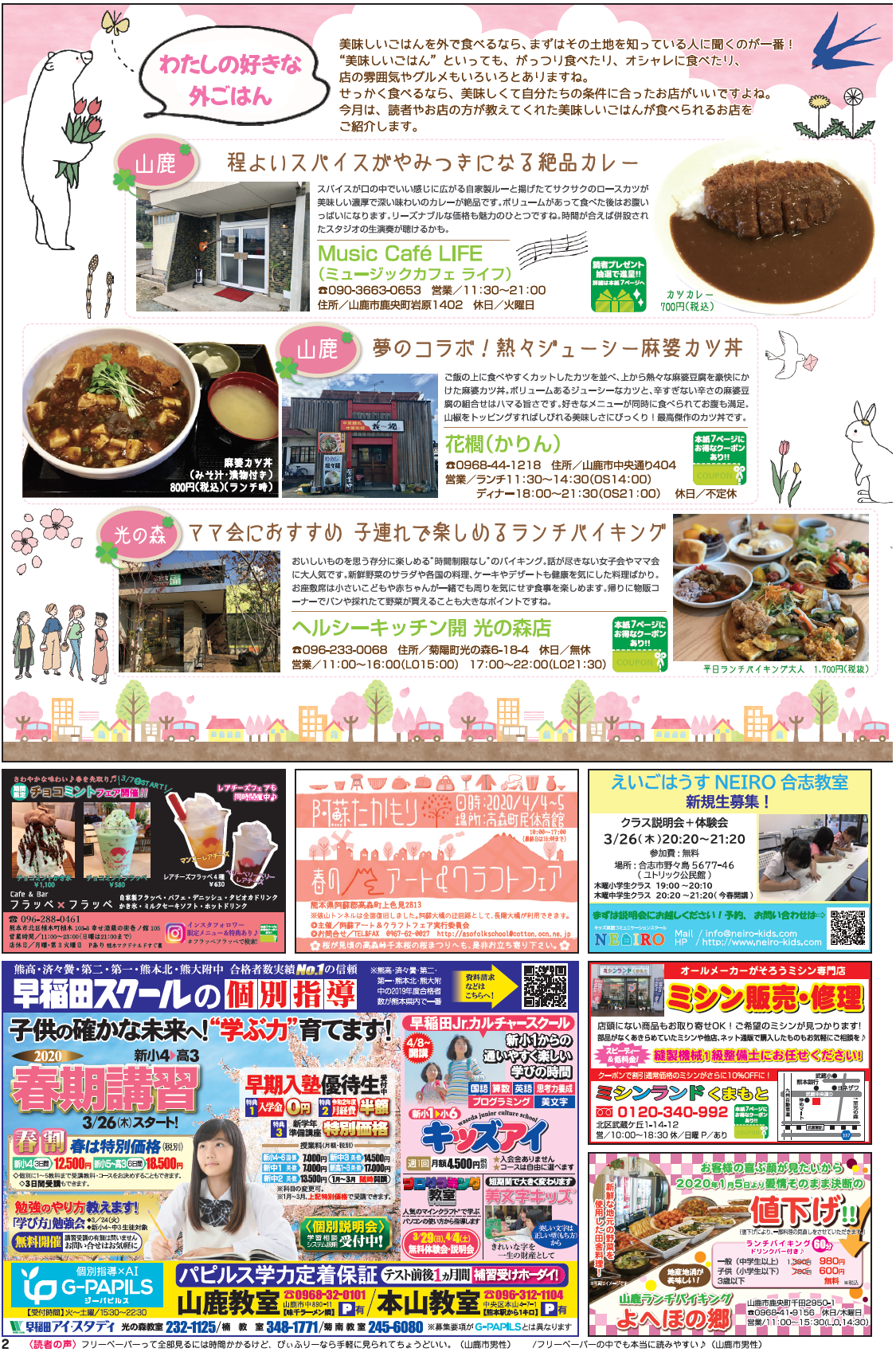 2020年3月号 【特集】わたしの好きな外ごはん 〜わたしの好きな外ごはん〜 美味しいごはんを外で食べるなら、まずはその土地を知っている人に聞くのが一番! ”美味しいごはん”といっても、がっつり食べたり、オシャレに食べたり、店の雰囲気やグルメもいろいろとありますね。 せっかく食べるなら、美味しくて自分たちの条件に合ったお店がいいですよね。 今月は、読者やお店の方が教えてくれた美味しいごはんが食べられるお店をご紹介します。