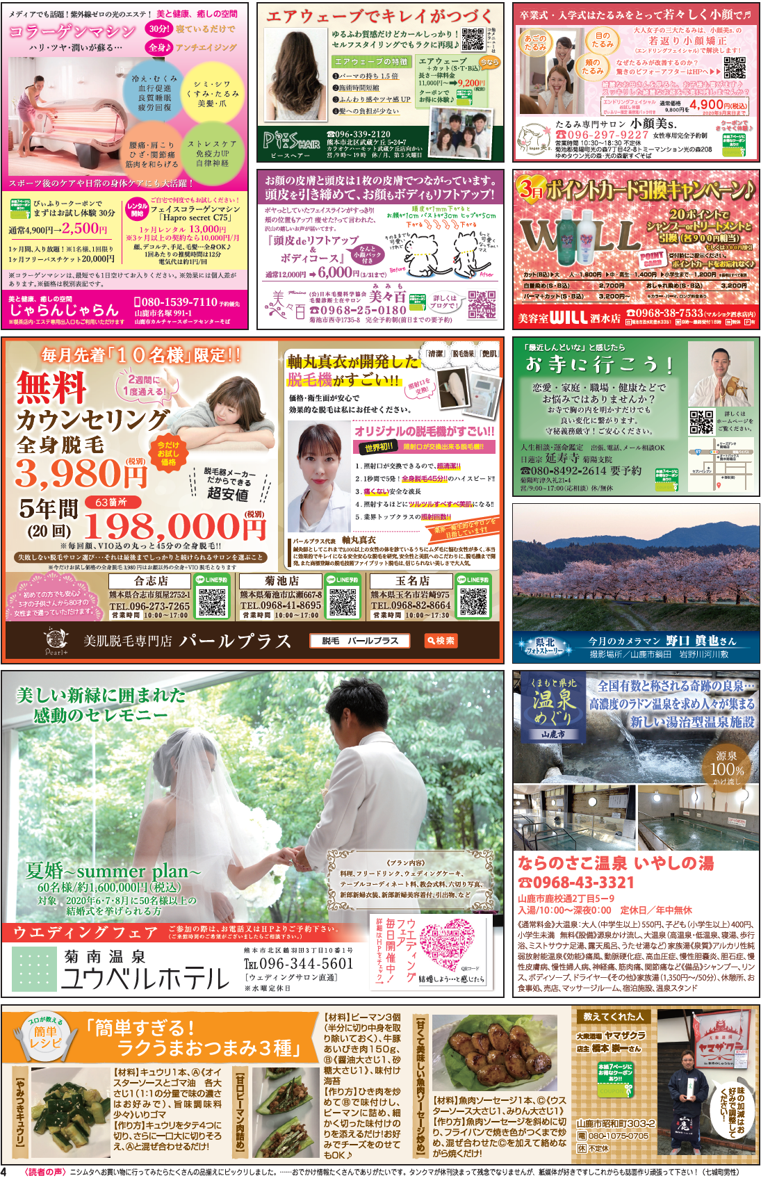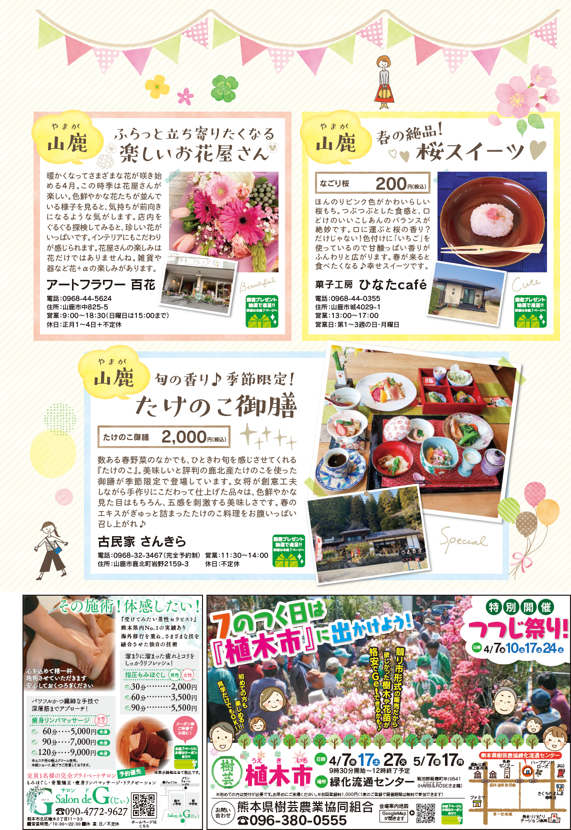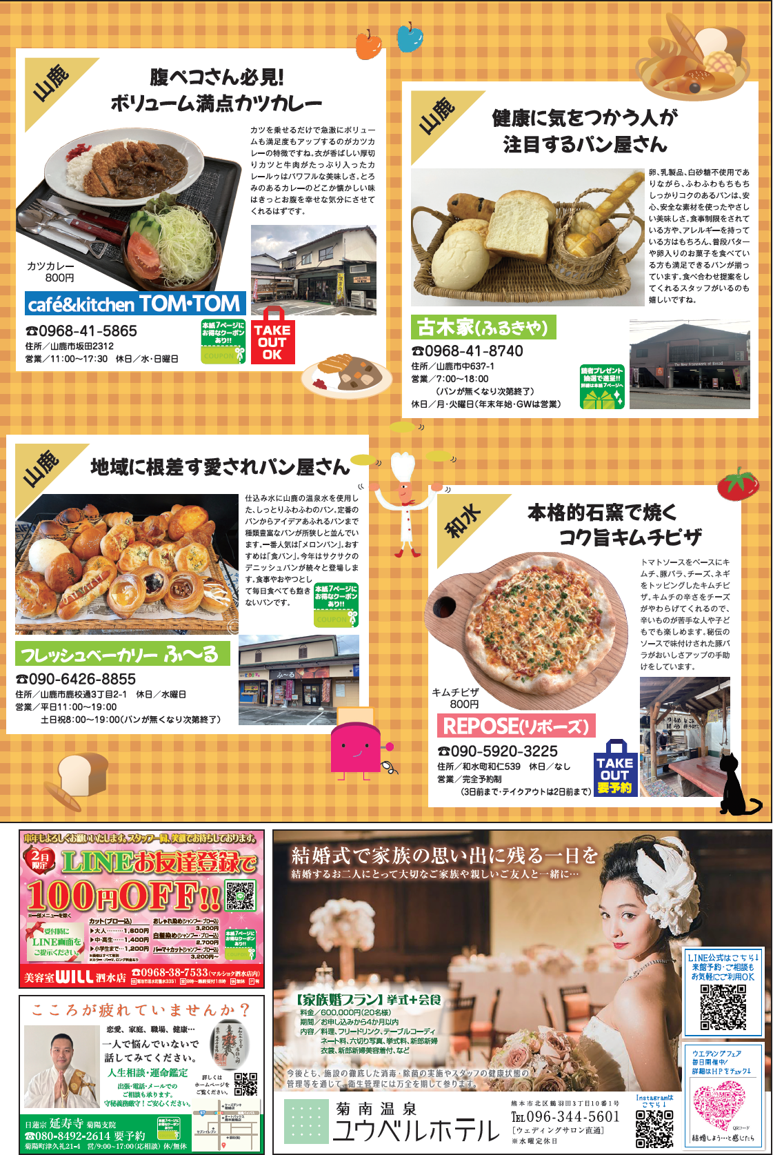 2020年2月号 【特集】パンのある暮らし 2020年2月号 【特集】パンのある暮らし 私たちが暮らす熊本県北地域には、私たちの生活と気持ちを豊かにしてくれるパン屋さんが たくさんあります。 焼き立て、ふわふわ、甘いスイーツ系や具だくさんの惣菜系などみんなパンが大好きです。 今月は、見た目も気になる注目パンや毎日食べても飽きない定番商品など各店のこだわりパン情報を お届けします。